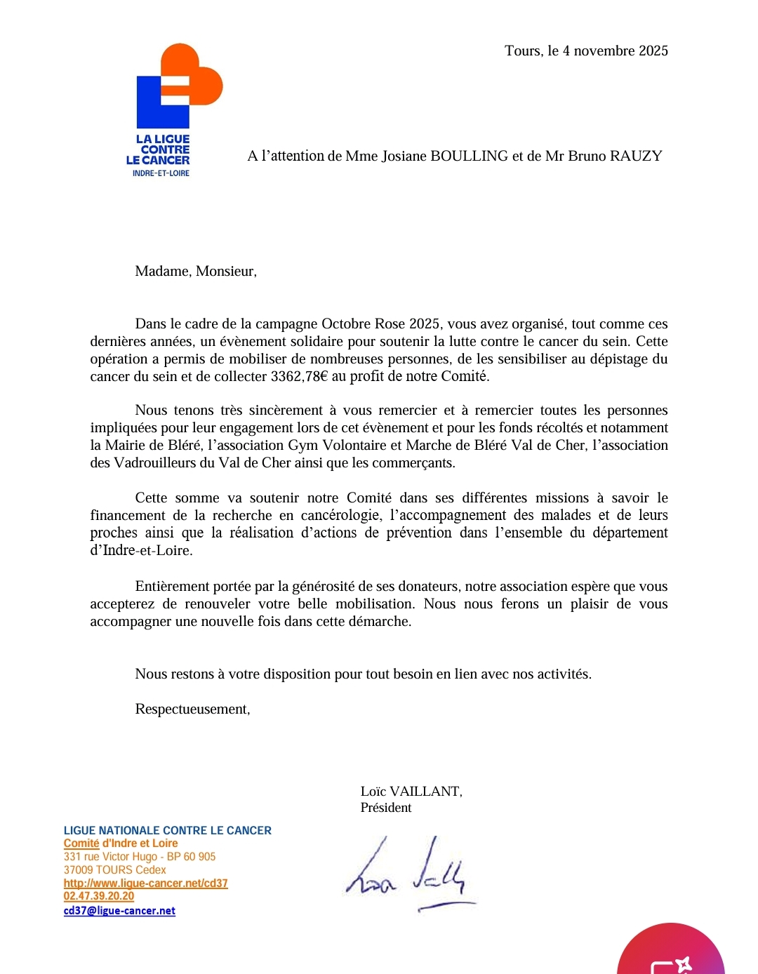 Octobre rose : Belle météo + belle participation = belle journée. Merci à tous les participants, merci aux bénévoles. Quelques photos de cette journée : ici et ci-dessous lettre de remerciement du professeur Loïc Vaillant.