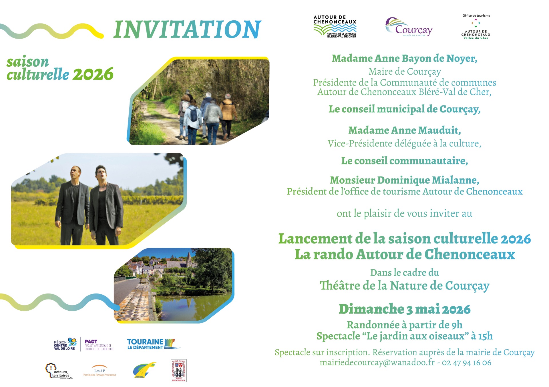 Randonnée de la communauté de communes "Autour de Chenonceaux" à Courçay, avec le soutien de "Chemin Faisant ", "3P", et des "Vadrouilleurs du Val du Cher". Départ de la randonnée : depuis la Place de l'Eglise entre 9h et 10h. Deux circuits un de 10 km et une variante "plus courte" + ravitaillement. Tarif de 4€ par personne et gratuit pour les -12 ans.