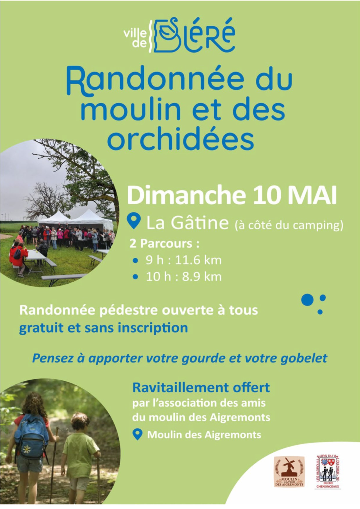 Randonnée du moulin et des orchidées (ex randonnée de printemps) à Bléré, organisée par la Ville de Bléré avec le soutien des "amis du moulin", et des "Vadrouilleurs du Val du Cher".