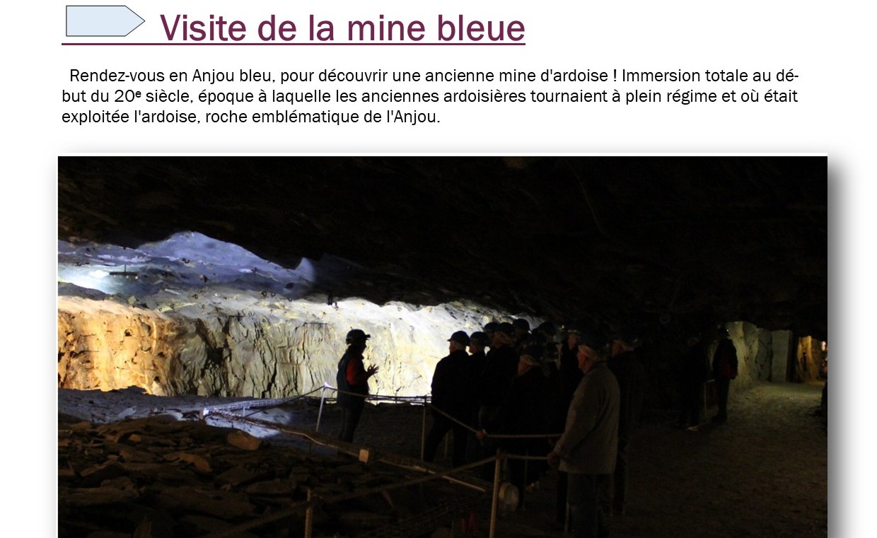 Dernier jour pour vous inscrire à la sortie en covoiturage "Anjou Bleu" du 26 juin. Visite du château du Patys (La Bellangerie du roman Vipère au poing d'Hervé Bazin) et d'une ancienne mine d'ardoise. Détails et inscription dans votre espace adhérents.